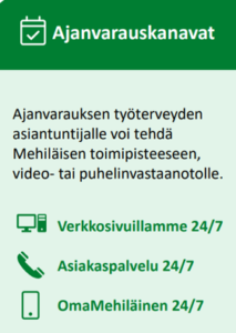 OmaMehiläinen -palvelu on käytettävissä 24/7. Digiklinikka on työterveysasiakkaiden ensisijainen asiointikanava, jossa voit asioida ilman ajanvarausta.